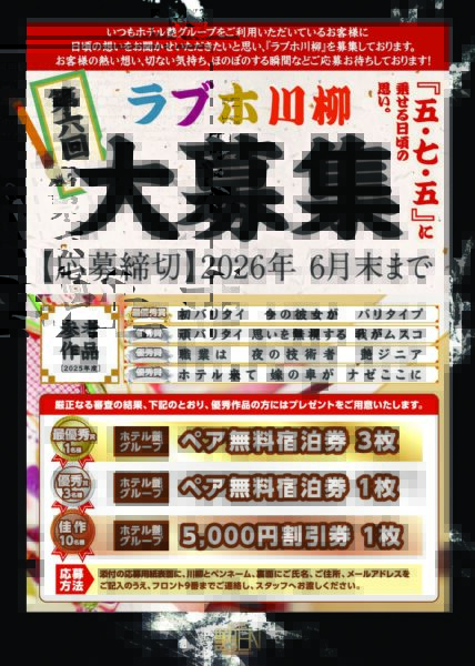 厳正なる審査のもと選ばれし方には、「ペア無料宿泊券」や「割引券」が贈呈されます