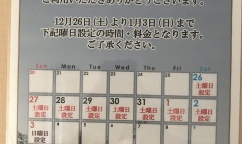 2020年末から2021年始までの料金・利用時間のご案内です。 12月26日~1月2日:土曜日の料金・利用時間1月3日:通常の日曜日の料金・利用時間 以上の様になります。